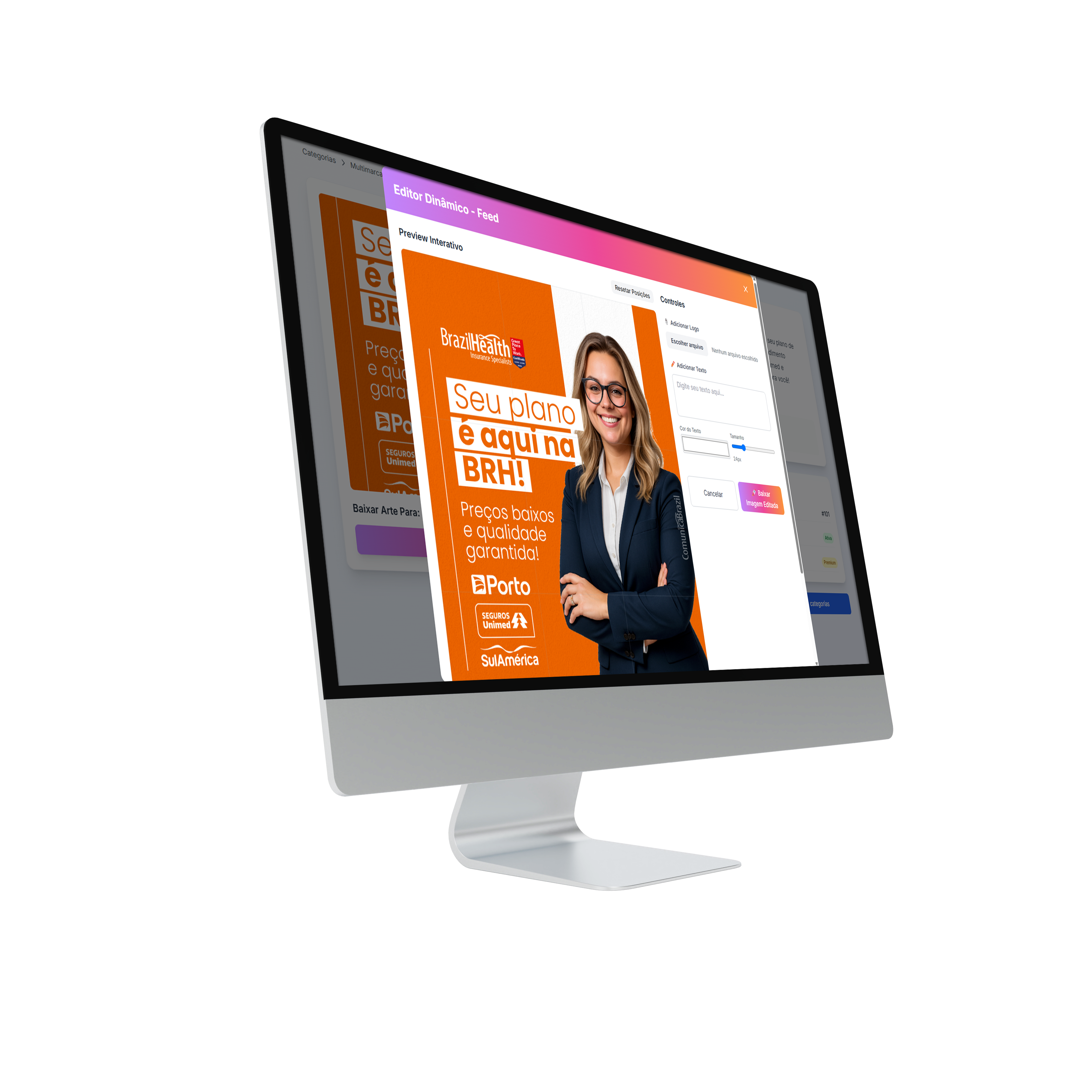 Personalize textos, cores e imagens arrastando e soltando. Exporte em alta qualidade em vários formatos.